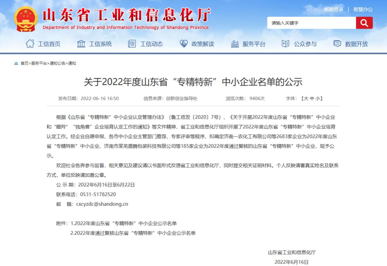 水发奥翔公司顺利入选2022年度山东省“专精特新”中小企业