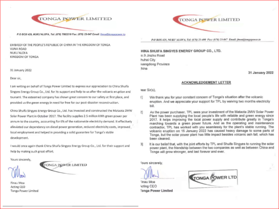 近日,汤加电力公司(Tonga Power Limited,以下简称“TPL”)向中国驻汤加大使馆及水发兴业能源集团发来感谢信,对企业持续关注汤加受灾情况并提供有力支持表示感谢。