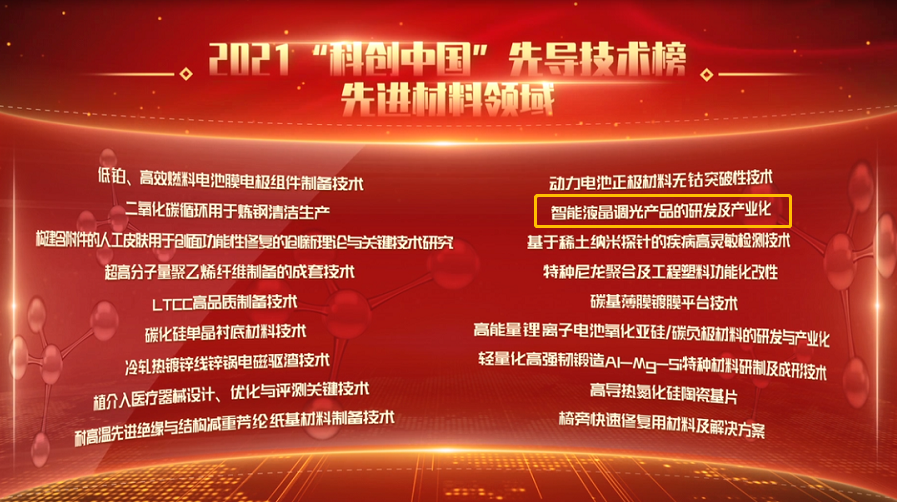 近日,2021年“科创中国”先导技术榜单结果公示,共遴选出100项具有开创、突破意义,可转移、转化、交易的先导技术成果。由中国兴业新材料控股有限公司选送的“智能液晶调光产品的研发及产业化”荣登榜单。