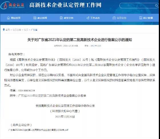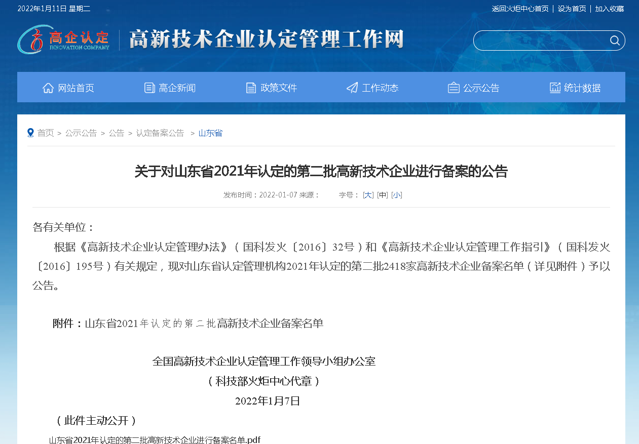 1月7日,全国高新技术企业认定管理工作领导小组办公室发布《关于对山东省2021年认定的第二批高新技术企业进行备案的公告》。青岛能安恒信科技有限公司成功列入《山东省2021年认定的第二批高新技术企业备案名单》。