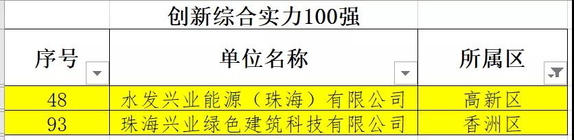 近日,珠海市科技创新局对2021年珠海市高新技术企业百强名单进行公示,中国水发兴业能源集团有限公司旗下权属公司再度入榜:水发兴业能源(珠海)有限公司入选经济贡献100强(排名51)和创新综合实力100强(排名48);珠海兴业绿色建筑科技有限公司入选创新综合实力100强(排名93)。