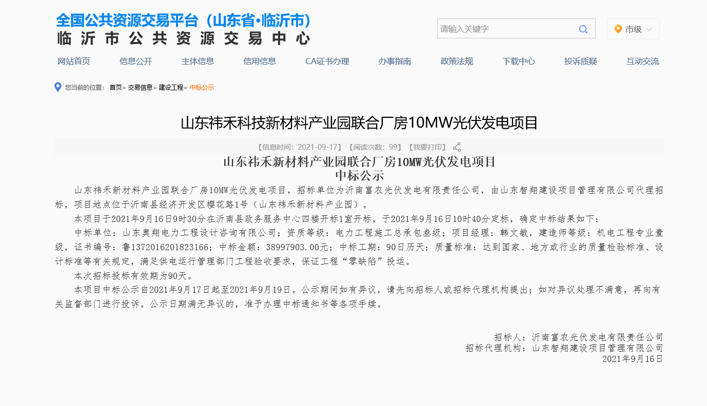 水发奥翔设计公司成功中标山东祎禾新材料产业园10MW光伏发电EPC项目